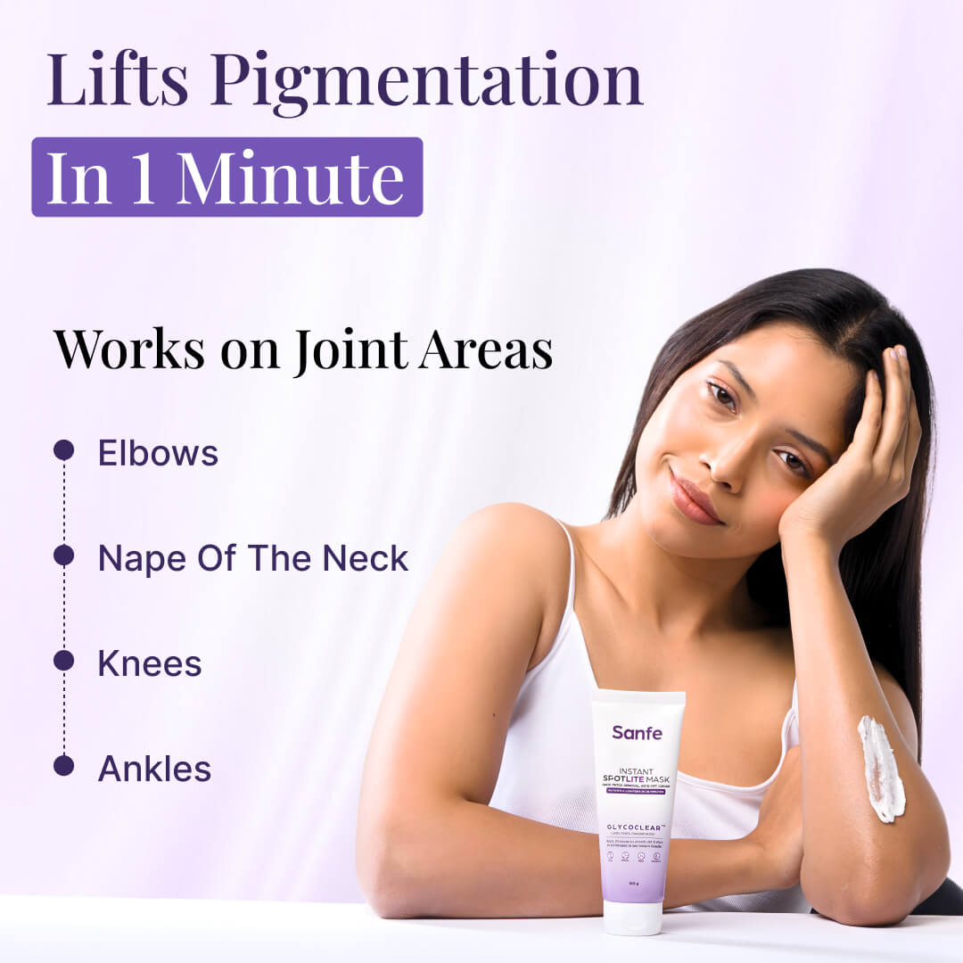 Sanfe Spotlite Mask is a targeted brightening and resurfacing mask created to address dark, uneven skin on underarms, neck, and other body areas where pigmentation builds up easily. Developed in collaboration with IIT Delhi, this advanced formula is powered by Glycoclear Technology™, a scientifically designed blend of AHAs and BHAs commonly used in professional skin resurfacing treatments.
